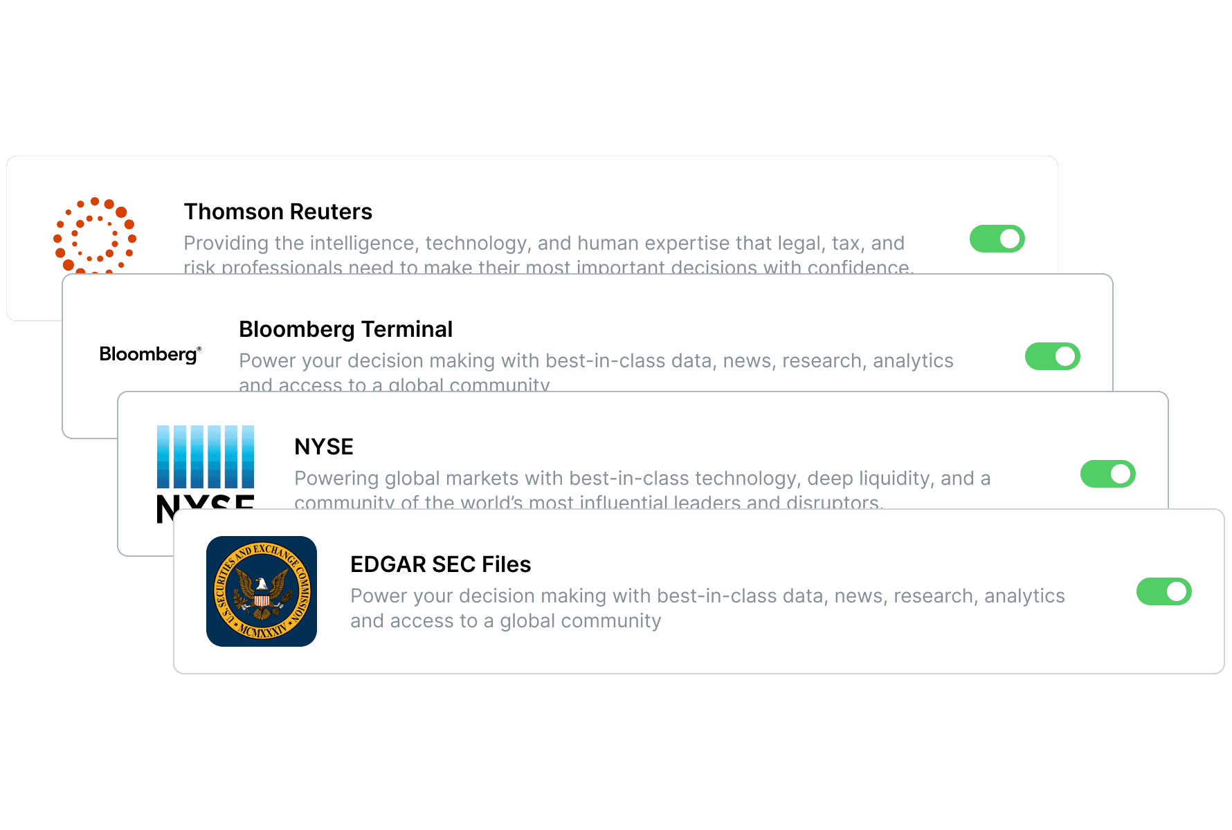 Professional workflows shouldn't be fragmented by disconnected sources. Our platform bridges the gap between your proprietary models and the world’s most authoritative financial databases.